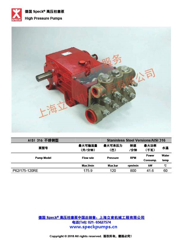 SPECK三柱塞泵適用于抽吸潔凈水及其他比重與水類似的非侵蝕性或研磨介質(zhì)。對于在抽吸其他液體,尤其是易燃、易爆及有毒介質(zhì)之前,在任何情況下都應(yīng)就泵材質(zhì)的抗性咨詢我司,我們將依據(jù)特殊介質(zhì)需要給予多款不同級別不銹鋼材質(zhì)型號泵的推薦,并能進(jìn)一步提供相配套的特殊材質(zhì)等級密封件以期達(dá)到特殊用戶的使用要求和使用滿意度。